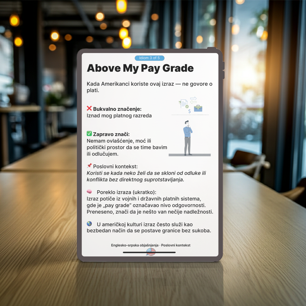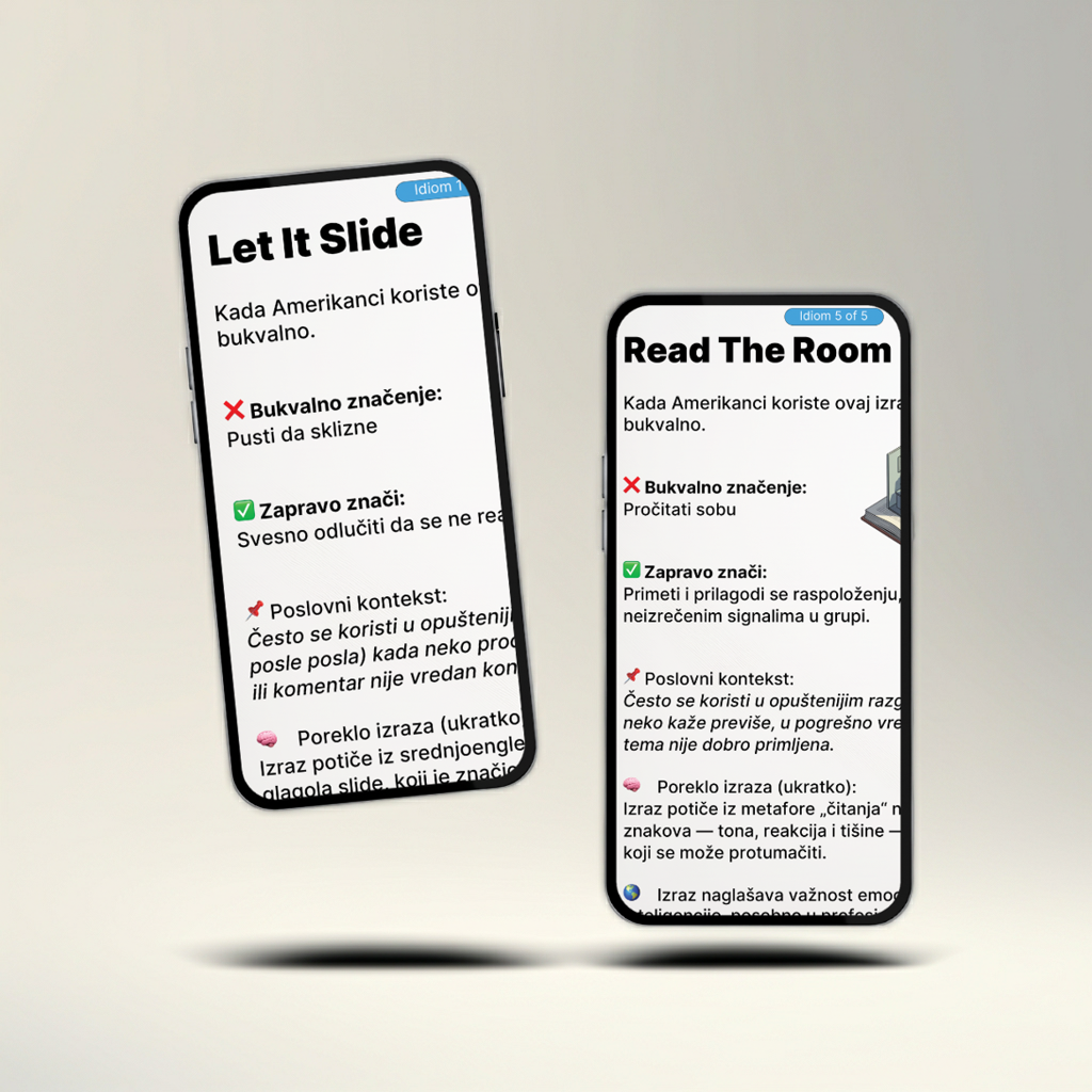 Ovaj kratki vodič objašnjava 5 tipičnih američkih idioma koji se koriste u opuštenim, ali i dalje poslovno relevantnim razgovorima — jasno, precizno i na srpskom jeziku.